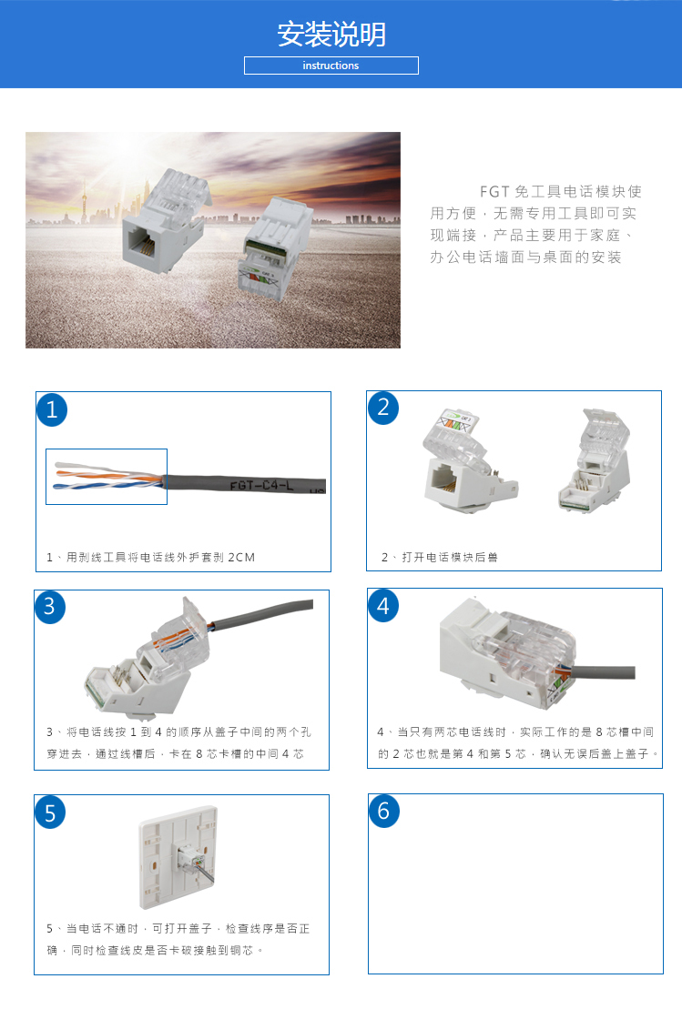 4芯電話模塊采用免壓接式安裝,用于各種電話線端接,無需工具,即可實現端接。方便快捷。執行標準:YD/T 926.3。