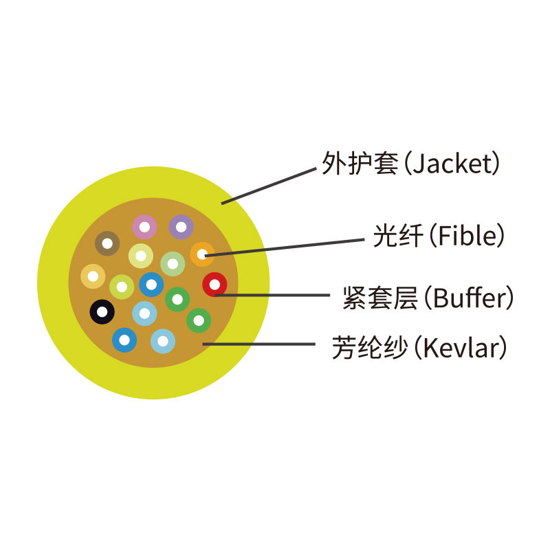 室內光纜是在緊套光纖外均勻增加加強作用的多股芳綸絲,再擠阻燃外護套而成.
